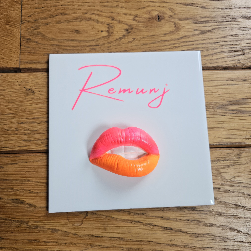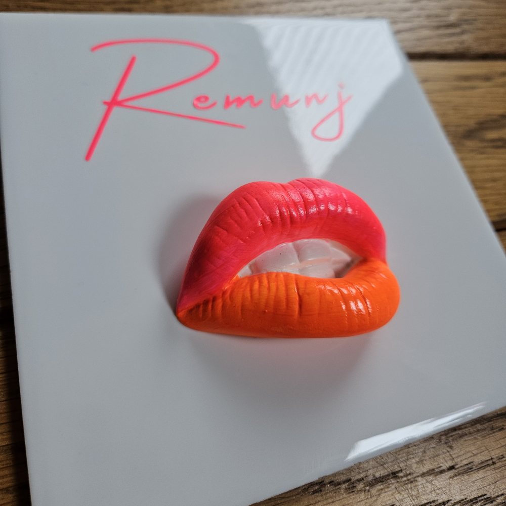 Sierlijke letter neon roze, mondje 'bite' neon roze/oranje